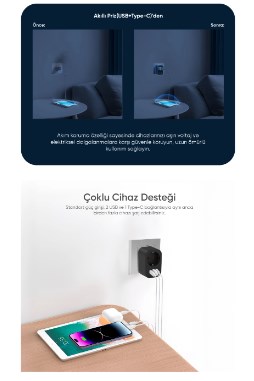 * Hepsi Bir Arada Şarj: Standart priz girişinin yanı sıra dahili 2 adet USB ve 1 adet Type-C portu ile telefon, tablet ve kulaklıklarınızı adaptör gerektirmeden doğrudan şarj edin.